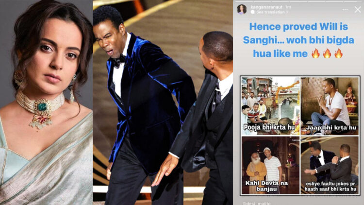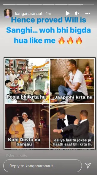വിൽസ്മിത്ത് ഹിന്ദു ആചാരങ്ങളിൽ പങ്കെടുത്തതിന്റേയും ക്ഷേത്രത്തിൽ പ്രാർത്ഥിക്കുന്നതിന്റേയും സദ്ഗുരുവിനോട് നിൽക്കുന്നതിന്റേയും ചിത്രങ്ങളാണ് കങ്കണ സ്റ്റോറിയിൽ പങ്കുവെച്ചത്. താനും സ്തുതി ഗീതങ്ങൾ പാടാറുണ്ടെന്നും എന്ന് വെച്ച് താൻ ദൈവമല്ലെന്നും അനാവശ്യ തമാശകൾ പറയുന്നവരുടെ മുഖത്ത് താൻ അടിയ്ക്കാറുണ്ടെന്നും കങ്കണ പറഞ്ഞു. വിൽ സ്മിത്തിന്റെ ഭാര്യ ജാദ പിക്കറ്റിന് അലോപേഷ്യ എന്ന രോഗമാണ്. തലമുടി മുഴുവനും കൊഴിഞ്ഞു പോകുന്ന ഒരു അവസ്ഥയാണിത്.