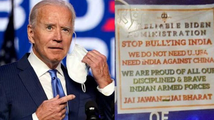 ‘ഇന്ത്യയെ ഭീഷണിപ്പെടുത്തുന്നത് നിർത്തുക’ എന്നാണ് പോസ്റ്ററിൽ പറയുന്നത്. ‘ഇന്ത്യയ്ക്ക് അമേരിക്കയുടെ ഒരു സഹായവും ആവശ്യമില്ല. ചൈനയ്ക്കെതിരെ പോരാടാൻ അമേരിക്കയ്ക്ക് ഇന്ത്യയുടെ സഹായമാണ് ആവശ്യം. ഞങ്ങളുടെ ധീരരായ സായുധ സേനയെ കുറിച്ചോർത്ത് ഞങ്ങൾ അഭിമാനിക്കുന്നു. ജയ് ജവാൻ ജയ് ഭാരത്’ എന്നാണ് പോസ്റ്ററിൽ എഴുതിയിരിക്കുന്നത്.