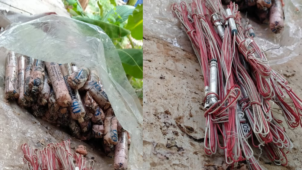 30 ജലാറ്റിൻ സ്റ്റിക്കുകളും 17 ഡിറ്റണേറ്ററുകളുമാണ് കണ്ടെത്തിയത്. നരിക്കോട് മലയിൽ താമസിക്കുന്ന ജോഷിയുടെ വീട്ടിൽ നിന്നുമാണ് ഇവ പിടിച്ചെടുത്തത്. ഇത്രയും സ്ഫോടക വസ്തുക്കൾ എന്തിനാണ് സൂക്ഷിച്ചതെന്ന കാര്യം വ്യക്തമായിട്ടില്ല. പോലീസ് കൂടുതൽ അന്വേഷണം നടത്തി വരികയാണ്.