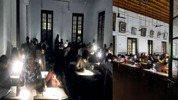 വൈദ്യുതി മുടങ്ങിയതിന് പുറമെ കനത്ത മഴക്കോൾ ഉണ്ടായിരുന്നതും മുറിയിൽ ഇരുട്ട് കനക്കാൻ കാരണമായി. പരീക്ഷ ഹാളുകളിൽ മൊബൈൽ ഫോൺ, സ്മാർട്ട് വാച്ച്, ഇയർഫോൺ ഉൾപ്പെടെയുള്ള ഇലക്ട്രോണിക് ഉപകരണങ്ങൾ കൊണ്ടു വരുന്നതിന് കർശന വിലക്കുണ്ട്. ഇവ സ്വിച്ച് ഓഫ് ആണെങ്കിൽ പോലും ഹാളിനുള്ളിൽ കയറ്റാൻ അനുവാദമില്ല. അതേസമയം വിദ്യാർത്ഥികൾ മൊബൈൽ ഫോൺ വെളിച്ചത്തിൽ പരീക്ഷ എഴുതിയ കാര്യം ശ്രദ്ധയിൽ പെട്ടിട്ടില്ലെന്നാണ് കോളേജ് അധികൃതർ പറയുന്നത്.