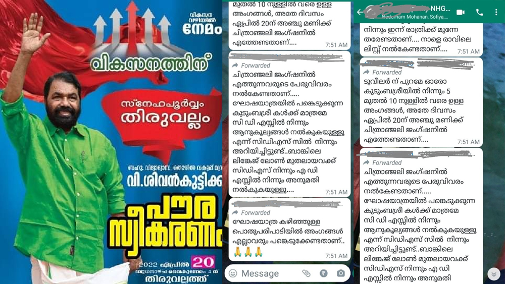 ഘോഷയാത്രയ്‌ക്ക് എത്താത്ത അംഗങ്ങൾക്ക് ലോൺ ഉൾപ്പെടെയുള്ള ആനുകൂല്യങ്ങൾ നൽകില്ലെന്ന് സിഡിഎസിൽ നിന്ന് അറിയിച്ചതായാണ് വാട്‌സ്ആപ്പ് സന്ദേശത്തിൽ പറയുന്നത്. ഓരോ കുടുംബശ്രീയിൽ നിന്നും അഞ്ച് മുതൽ 10 വരെയുള്ള അംഗങ്ങൾ ചിത്രാഞ്ജലി ജംഗ്ഷനിൽ എത്തേണ്ടതാണ്. ഘോഷയാത്രയിൽ പങ്കെടുക്കുന്ന കുടുംബശ്രീ അംഗങ്ങൾക്ക് മാത്രമെ സിഡിഎസ്സിൽ നിന്നും ആനുകൂല്യങ്ങൾ ലഭിക്കുകയുള്ളൂ എന്നും സന്ദേശത്തിൽ പറയുന്നു.