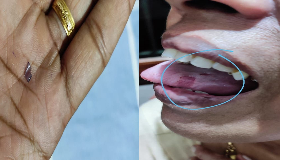 കോഴിക്കോട്: പലഹാരത്തിൽ കല്ലുകടി ചിലപ്പോഴൊക്കെ അനുഭവപ്പെടാറുണ്ട്. പുത്തരിയിൽ കല്ലുകടിയെന്ന പ്രയോഗവും കേട്ടിട്ടുണ്ട്. ചില്ലുകടിയെന്നത് അത്ര പരിചയമില്ല. എന്നാൽ കോഴിക്കോട് വടകര അയിനിക്കാട് സ്വദേശിനി രാധയ്‌ക്കാണ് കുപ്പിച്ചില്ലുകൊണ്ടു നാവിന് പരുക്കേറ്റത്.