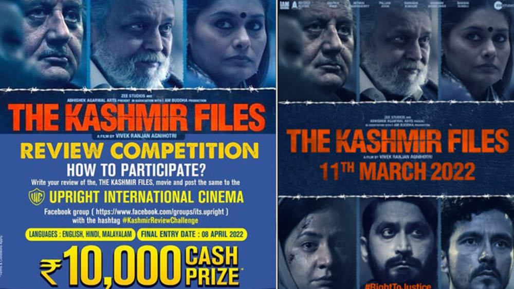 കോട്ടയം: കശ്മീർ ഫയൽസ് ഫിലിം റിവ്യൂ മത്സരത്തിലെ വിജയികളെ പ്രഖ്യാപിച്ചു. കൂടുതൽ ലൈക്കുകൾ കിട്ടിയ പത്തുപോസ്റ്റുകളിൽ നിന്നും മികച്ചുനിന്ന മൂന്ന് പോസ്റ്റുകൾ തിരഞ്ഞെടുക്കുക ആയിരുന്നു. ഒന്നാം സമ്മാനമായ 10000 രൂപയ്ക്ക് അർഹനായിരിക്കുന്നത് ഹരി തമ്പായി ആണ്. രണ്ടാം സമ്മാനമായ 6000 രൂപയ്ക്ക് രഞ്ജിത് രവീന്ദ്രനും, മൂന്നാം സമ്മാനമായ 3000 രൂപ വിപിൻ കൂടിയേടത്തും സ്വന്തമാക്കി. അപ്പ് റൈറ്റ് ഇന്റർനാഷണൽ സിനിമ എന്ന ഫേസ്ബുക്ക് സിനിമ ഗ്രൂപ്പാണ് മത്സരം സംഘടിപ്പിച്ചത്. സിനിമാ സംവിധായകനായ വിജയകൃഷ്ണനും തിരക്കഥാകൃത്ത് ശ്യാം ശ്രീകുമാറുമായിരുന്നു ജഡ്ജിംഗ് പാനലിൽ ഉണ്ടായിരുന്നത്.