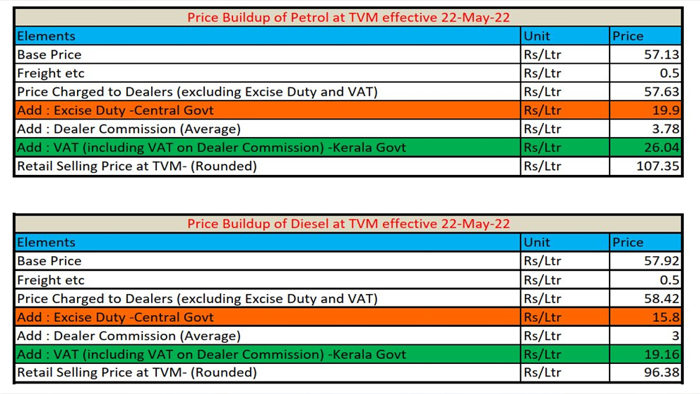 കൂടാതെ 57 രൂപ അടിസ്ഥാന വിലയുള്ള പെട്രോളിന് കേന്ദ്രം ഈടാക്കുന്ന എക്സൈസ് തീരുവ 19.9 രൂപയും സംസ്ഥാനം ഈടാക്കുന്ന വാറ്റ് തുക 26.04 രൂപയുമാണ്. ഇതിനോടൊപ്പം നേരിയ തുകകളായ ചരക്ക് നികുതിയും ഡീലർ കമ്മീഷനും കൂട്ടിച്ചേർത്താണ് തിരുവനന്തപുരത്ത് ലിറ്ററിന് 107.35 രൂപയ്ക്ക് പെട്രോൾ ലഭിക്കുന്നത്. അതായത്, കേന്ദ്രത്തിനേക്കാൾ കൂടുതൽ നികുതിയാണ് സംസ്ഥാനം ഈടാക്കുന്നതെന്ന് ചുരുക്കം.
