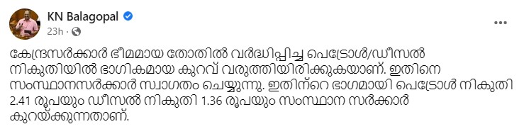 കേന്ദ്രസർക്കാർ പെട്രോൾ/ഡീസൽ നികുതിയിൽ കുറവ് വരുത്തിയിരിക്കുകയാണെന്നും ഇതിനെ സംസ്ഥാന സർക്കാർ സ്വാഗതം ചെയ്യുന്നു എന്നുമായിരുന്നു പോസ്റ്റിന്റെ സാരാംശം. എന്നാൽ അവസാനമായി ഒരു വരികൂടി ബഹുമാനപ്പെട്ട ധനമന്ത്രി കെ.എൻ ബാലഗോപാൽ കൂട്ടിച്ചേർത്തിരുന്നു.