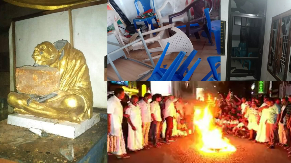 സംസ്ഥാനത്തെ കലാപഭൂമിയാക്കി സിപിഎം; ഗാന്ധി പ്രതിമയുടെ തലവെട്ടി, ബോംബേറ്: വ്യാപക പ്രതിഷേധം