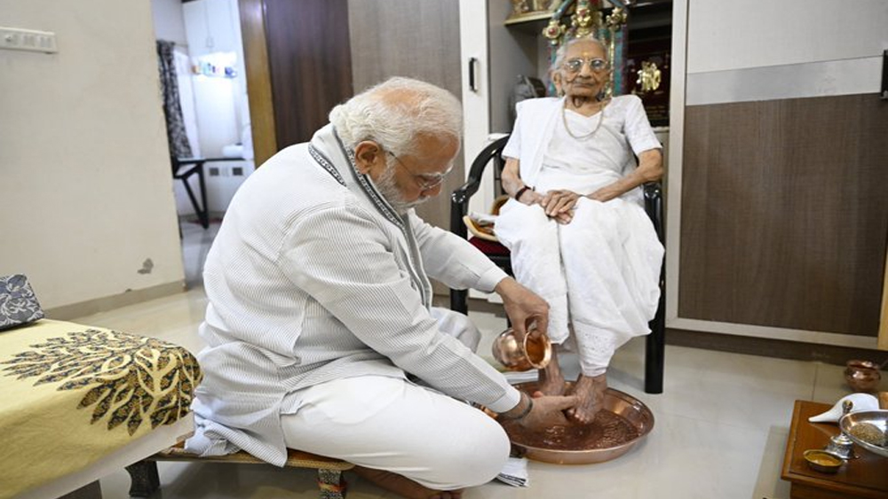 ന്യൂഡൽഹി: അമ്മയുടെ 100ാം ജന്മദിനം ആഘോഷിക്കാൻ പ്രധാനമന്ത്രി നരേന്ദ്രമോദി ഗാന്ധിനഗറിലെ വസതിയിലെത്തി. അമ്മയെ കണ്ട് അനുഗ്രഹം വാങ്ങിയ പ്രധാനമന്ത്രി, അമ്മയുടെ കാലുകൾ കഴുകി പത്യേക പൂജകളും നടത്തി. വഡ്നഗറിലെ ഹട്കേശ്വർ ക്ഷേത്രത്തിലും ജന്മദിനാഘോഷത്തിന്റെ ഭാഗമായി പ്രത്യേക ചടങ്ങുകൾ നടക്കുന്നുണ്ട്. അമ്മയെ സന്ദർശിച്ചതിന് ശേഷമുള്ള നിരവധി ചിത്രങ്ങളും അദ്ദേഹം സമൂഹമാദ്ധ്യമങ്ങളിൽ പങ്കുവച്ചിട്ടുണ്ട്. പ്രധാനമന്ത്രിയുടെ ഇളയ സഹോദരൻ പങ്കജ് മോദിക്കൊപ്പം റെയ്സൻ ഗ്രാമത്തിലാണ് ഹീരാബെൻ താമസിക്കുന്നത്.