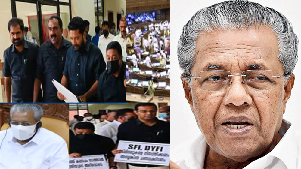 രാഹുൽ ഗാന്ധിയുടെ വയനാട്ടിലെ ഓഫീസ് എസ്എഫ്ഐ തകർത്തതും, സ്വർണ്ണക്കടത്തിൽ മുഖ്യമന്ത്രിക്ക് എതിരായ സ്വപ്നയുടെ വെളിപ്പെടുത്തലും അടക്കം വിവാദ വിഷയങ്ങളുടെ പശ്ചാത്തലത്തിലാണ് സഭയിൽ ഇന്ന് പ്രതിപക്ഷം പ്രതിഷേധിച്ചത്. പ്ലക്കാർഡുകളും ബാനറുകളും ഉയർത്തി എംഎൽമാർ കറുപ്പണിഞ്ഞായിരുന്നു എത്തിയത്.