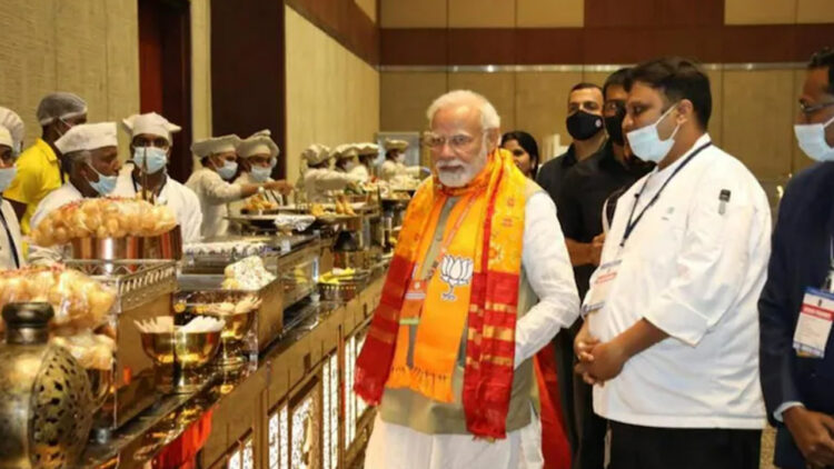ഹൈദരാബാദ് : ബിജെപി ദേശീയ നിർവ്വാഹക സമിതി യോഗത്തിനായി ഭക്ഷണം തയ്യാറാക്കിയ പാചക വിദഗ്ധരെ നേരിട്ടെത്തി അഭിനന്ദിച്ച് പ്രധാനമന്ത്രി നരേന്ദ്ര മോദി. രാജ്യത്തിന്റെ പല ഭാഗങ്ങളിൽ നിന്നായി പല രീതിയിലുള്ള വിഭവങ്ങളാണ് യോഗത്തിന് ശേഷം നേതാക്കൾക്കായി വിളമ്പിയത്. ഇതിന്റെയെല്ലാം സവിശേഷതകൾ എന്താണെന്ന് പ്രധാനമന്ത്രി പാചക വിദഗ്ധരോട് തന്നെ ചോദിച്ചറിഞ്ഞു.