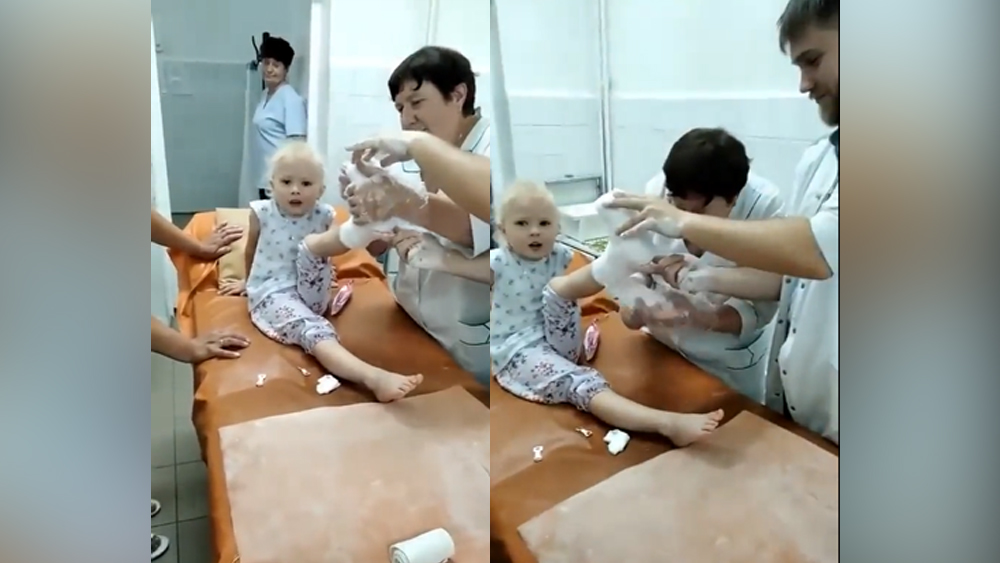 A little girl sings Ukrainian anthem while she getting her bandages.