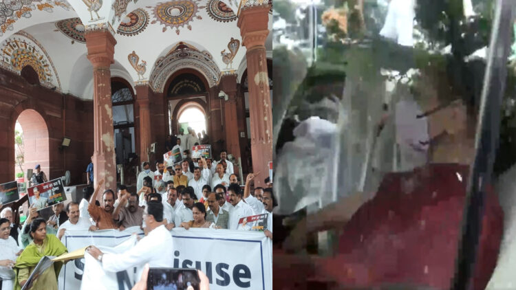 ഇതിന് പിന്നാലെ കോൺഗ്രസ് എംപിമാർ ബാനറുകൾ പിടിച്ച് പാർലമെന്റിന് പുറത്തേക്ക് മാർച്ച് നടത്തി. ഇവർ പ്രത്യേക വാഹനത്തിലാണ് എഐസിസി ആസ്ഥാനത്തെത്തിയത്. പ്രതിഷേധത്തിനുള്ള സാധ്യത കണക്കിലെടുത്ത്ആസ്ഥാനം നിലനിൽക്കുന്ന മേഖലയിൽ പോലീസ് നിരോധനാജ്ഞ പ്രഖ്യാപിച്ചിരുന്നു. ഇത് ഇത് ലംഘിച്ചുകൊണ്ടായിരുന്നു കോൺഗ്രസിന്റെ പ്രതിഷേധം.