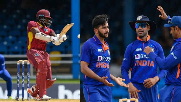 ബൗളിംഗിൽ ഇന്ത്യയ്ക്കായി മുഹമ്മദ് സിറാജും ഷാർദ്ദൂൽ ഠാക്കുറും യുസ്വേന്ദ്ര ചാഹലും രണ്ടു വിക്കറ്റുകൾ വീതം വീഴ്ത്തി. ടോസ് നേടി ഇന്ത്യയെ ബാറ്റിംഗിനയച്ച് കരീബിയൻ ബൗളർമാരെ കണക്കറ്റ് ശിക്ഷിച്ചുകൊണ്ടാണ് ഇന്ത്യൻ ഓപ്പണിംഗ് നിര മികച്ച തുടക്കമിട്ടത്. നായകൻ ശിഖർ ധവാൻ 97 റൺസും ശുഭ്മാൻ ഗിൽ 64 റൺസും ശ്രേയസ്സ് അയ്യർ 54 റൺസും നേടിയതോടെ ഇന്ത്യ 3 വിക്കറ്റിന് 240 എന്ന ശക്തമായ നിലയിലേക്കാണ് 35-ാം ഓവറിൽ എത്തിയത്.