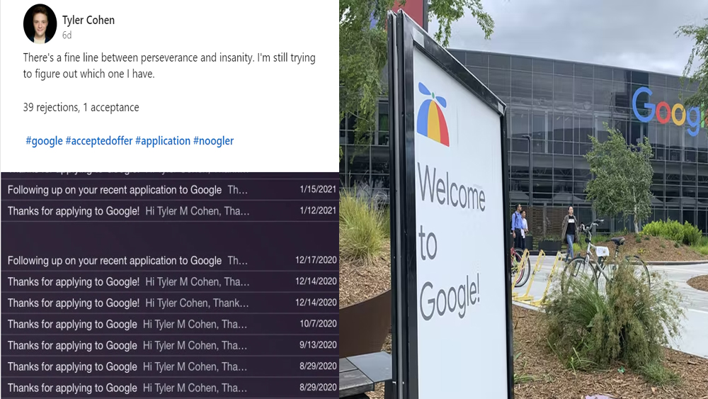 ടെക് കമ്പനിയായി ഗൂഗിളിൽ ഒരു ജോലി എന്ന സ്വപ്നം യാഥാർത്ഥ്യമാക്കാൻ സാൻ ഫ്രാൻസിസ്കോ സ്വദേശിയായ ടൈലർ കോഹൻ നടത്തിയ പരിശ്രമങ്ങളുടെ കഥ സാമൂഹിക മാദ്ധ്യമങ്ങളിൽ വൈറലാകുന്നു. കോഹൻ അയച്ച 39 അപേക്ഷകൾ നിരസിച്ച ശേഷം, നാൽപ്പതാം തവണ അയച്ച അപേക്ഷ കമ്പനി സ്വീകരിക്കുകയായിരുന്നു. ഇതുമായി ബന്ധപ്പെട്ട വിവരങ്ങൾ ലിങ്ക്ഡിനിലാണ് കോഹൻ പങ്കു വെച്ചിരിക്കുന്നത്.