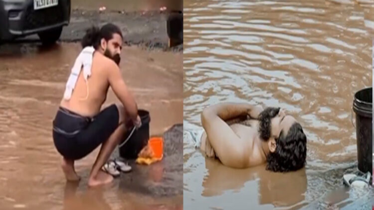 നടുറോഡിലെ കുഴിയിൽ കുളിച്ചും തുണി അലക്കിയും വെറൈറ്റി പ്രതിഷേധവുമായി യുവാവ്