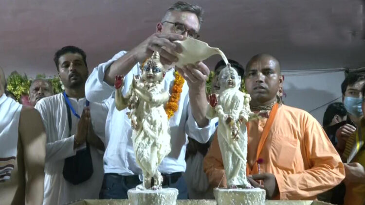 ന്യൂഡൽഹി: ജന്മാഷ്ടമി ദിനത്തിൽ ഇന്ത്യയിലെ ഹിന്ദു വിശ്വാസികളുടെ ആഘോഷത്തിൽ പങ്കുകൊണ്ട് ബ്രിട്ടീഷ് സ്ഥാനപതി അലക്സ് എല്ലിസ്. ഡൽഹിയിലെ ഇസ്കോൺ ക്ഷേത്രത്തിൽ ദർശനം നടത്തി. അദ്ദേഹത്തിന്റെ ക്ഷേത്ര ദർശനത്തിന്റെ ചിത്രങ്ങൾ സമൂഹമാദ്ധ്യമങ്ങളിൽ വ്യാപകമായി പ്രചരിക്കുന്നുണ്ട്.