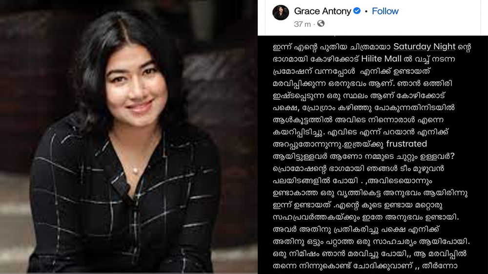 കോഴിക്കോട്: സിനിമയുടെ പ്രമോഷൻ പരിപാടിയ്ക്കിടെ ലൈംഗികാതിക്രമം ഉണ്ടായെന്ന പരാതിയുമായി പ്രശസ്ത യുവനടി ഗ്രേസ് ആന്റണി. ഫേസ്ബുക്ക് പോസ്റ്റിലൂടെയായിരുന്നു നടി പരാതി ഉന്നയിച്ച് രംഗത്ത് വന്നത്. തന്റെ സഹപ്രവർത്തകയ്ക്കും സമാനമായ അനുഭവം ഉണ്ടായതായി ഗ്രേസ് ആന്റണി ഫേസ്ബുക്ക് കുറിപ്പിൽ വ്യക്തമാക്കി.
