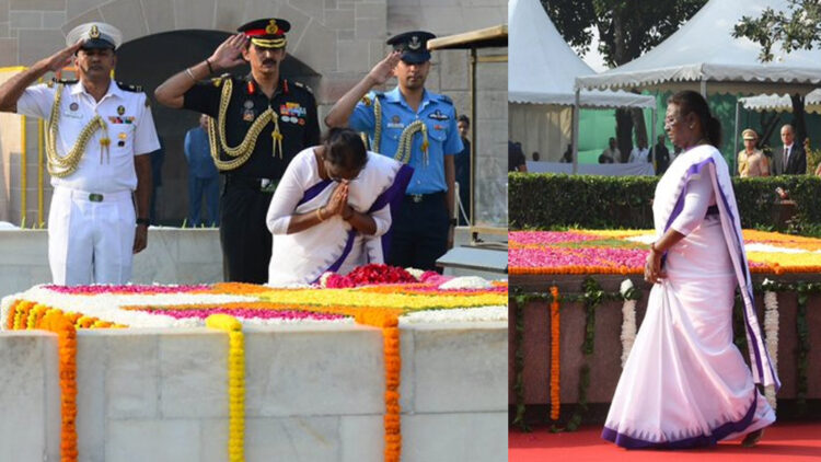 #WATCH | President Droupadi Murmu pays tribute to Mahatma Gandhi at Rajghat on #GandhiJayanti pic.twitter.com/SNA5mtGidA