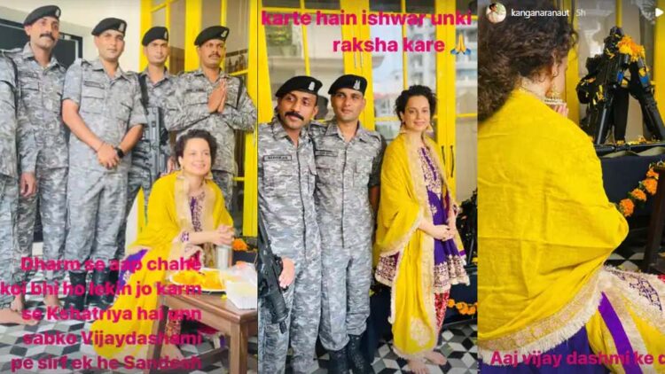 മുംബൈ; സിആർപിഎഫ് ജവാൻമാർക്കൊപ്പം ആയുധപൂജയിൽ പങ്കെടുത്ത് ബോളിവുഡ് താരം കങ്കണാ റണാവത്. മുംബൈയിലെ വസതിയിൽ നടത്തിയ പൂജയുടെ ചിത്രങ്ങൾ കങ്കണ ഇൻസ്റ്റഗ്രാം സ്റ്റോറീസ് ആയി പങ്കുവെച്ചു. തനിക്ക് സുരക്ഷയൊരുക്കുന്ന സിആർപിഎഫ് ജവാൻമാർക്കൊപ്പമായിരുന്നു കങ്കണ ആയുധപൂജയിൽ പങ്കെടുത്തത്.