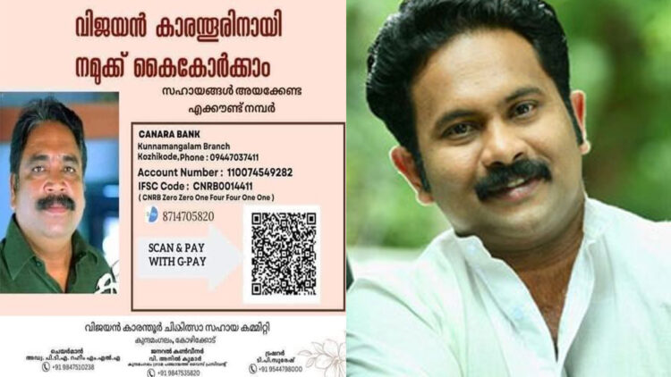 എറണാകുളം : കരൾ രോഗത്തിന് ചികിത്സയിൽ കഴിയുന്ന നടൻ വിജയൻ കാരന്തൂരിന് സഹായം അഭ്യർത്ഥിച്ച് നടൻ അജു വർഗീസ്. ഫേസ്ബുക്കിലൂടെയാണ് താരം സഹായം അഭ്യർത്ഥിച്ചിരിക്കുന്നത്. വിജയൻ കാരന്തൂരിനായി നമ്മുക്ക് കൈകോർക്കാം എന്ന പോസ്റ്ററും അജു പങ്കുവച്ചിട്ടുണ്ട്. പോസ്റ്ററിൽ കാരന്തൂരിന്റെ ബാങ്ക് അക്കൗണ്ട് വിവരങ്ങളും ഉൾപ്പെടുത്തിയിട്ടുണ്ട്.