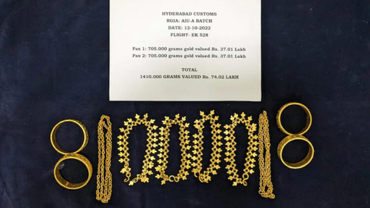 ഹൈദരാബാദ്: ഹൈദരാബാദ് വിമാനത്താവളത്തിൽ വൻ സ്വർണ്ണവേട്ട. 74.02 ലക്ഷം വിലമതിക്കുന്ന സ്വർണ്ണവുമായി രണ്ട് സ്ത്രീകൾ പിടിയിൽ. ദുബായിൽ നിന്നെത്തിയവരെയാണ് കസ്റ്റംസ് ഉദ്യോഗസ്ഥർ പിടികൂടിയത്.