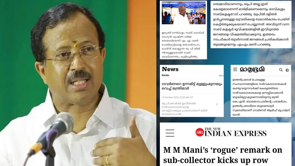 ഉത്തർപ്രദേശുകാരനായതിനാൽ ദേവികുളം സബ് കളക്ടർ മോശക്കാരനാ ണെന്ന് എംഎം മണി ആക്രോശിക്കുന്നു. ”വൺ ടൂ ത്രീ” എന്ന് മനുഷ്യരെ കൊന്നുതള്ളിയ മണിയാണ് ഉത്തർപ്രദേശുകാർക്ക് സംസ്കാരമില്ലെന്ന് പറയുന്നത് !