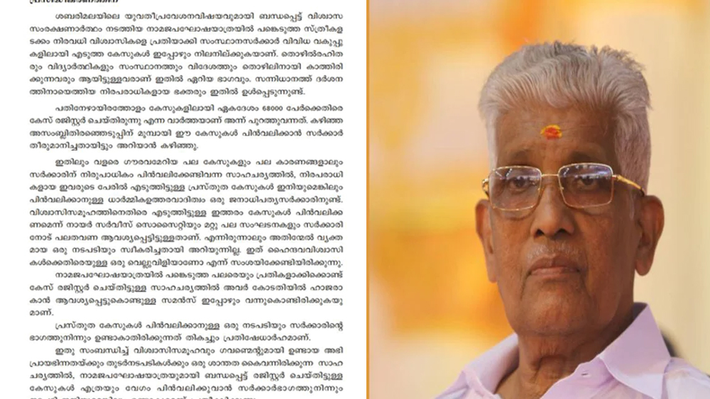 ശബരിമല നാമജപ ഘോഷയാത്രയിൽ പങ്കെടുത്തവർക്കെതിരായ കേസുകൾ പിൻവലിക്കണം; ആവശ്യവുമായി എൻ എസ് എസ്