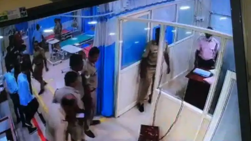 ഇന്നലെ രാത്രി ഒൻപത് മണിയോടെയായിരുന്നു സംഭവം. കഞ്ചാവ് കൈവശം വെച്ചതിന് കക്കാട് നിന്ന് ടൗൺ പോലീസാണ് പ്രതിയെ അറസ്റ്റ് ചെയ്തത്. തുടർന്ന് ഇയാളെ വൈദ്യ പരിശോധനക്ക് വേണ്ടി ആശുപത്രിയിൽ എത്തിച്ചപ്പോഴായിരുന്നു അതിക്രമം. മുറിയിലെ ചില്ല് ഇയാൾ തലകൊണ്ട് അടിച്ച് പൊട്ടിച്ചു. അക്രമത്തിൽ ടൗൺ എസ്‌ഐ എ ഇബ്രാഹിം, സിവിൽ പോലീസ് ഓഫീസർമാരായ എം ടി അനൂപ്, കെ നവീൻ എന്നിവർക്കും പരുക്കേറ്റു.