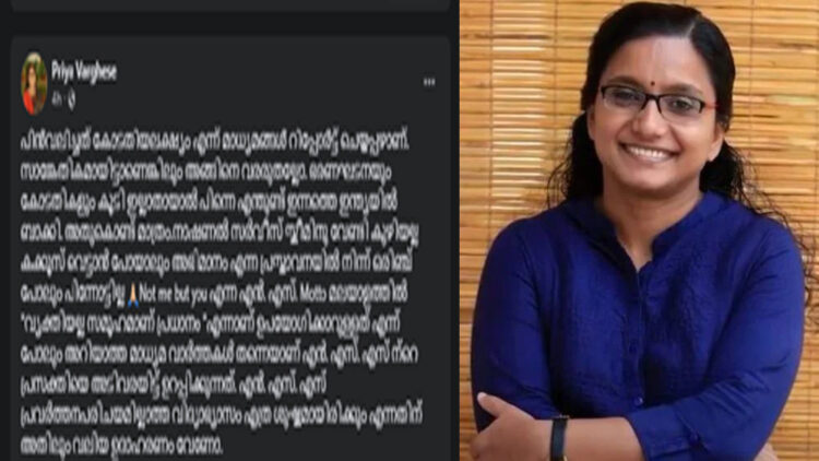 അസോസിയേറ്റ് പ്രൊഫസറുമായി ബന്ധപ്പെട്ട ഹർജി പരിഗണിക്കുന്നതിനിടെ എൻഎസ്എസിലെ പ്രവർത്തിപരിചയം അദ്ധ്യാപന യോഗ്യതയായി കണക്കാക്കാൻ കഴിയില്ലെന്ന് ഹൈക്കോടതി പറഞ്ഞിരുന്നു. ഇതിനോട് ആയിരുന്നു എൻഎസ്എസിന് വേണ്ടി കുഴിയല്ല കക്കൂസ് വെട്ടിയാലും അഭിമാനം മാത്രമാണെന്ന് പറഞ്ഞ് പ്രിയ വർഗ്ഗീസ് ഫേസ്ബുക്ക് പോസ്റ്റിട്ടത്. ഇത് ശ്രദ്ധയിൽപ്പെട്ടതോടെ കോടതി കടുത്ത ഭാഷയിൽ വിമർശിക്കുകയും പ്രിയ വർഗ്ഗീസ് ന്യായീകരണവുമായി രംഗത്ത് വരികയും ചെയ്തിരുന്നു. ഇതിന് പിന്നാലെയാണ് വീണ്ടും ഫേസ്ബുക്കിൽ പ്രസ്താവനയിൽ ഉറച്ചു നിൽക്കുന്നതായി പ്രിയ വർഗ്ഗീസ് പറയുന്നത്.