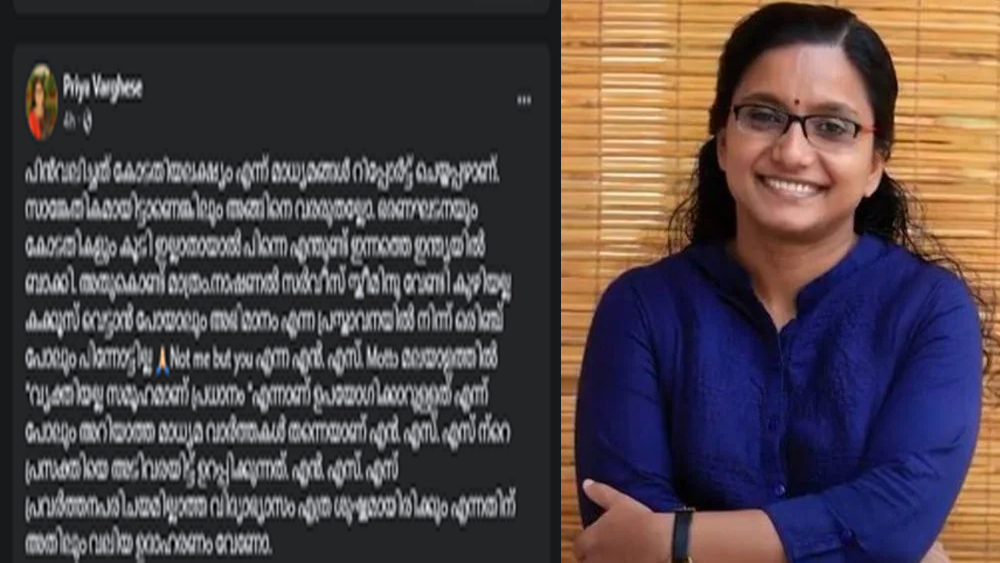 പോസ്റ്റ് പിൻവലിച്ചത് കോടതിയലക്ഷ്യം എന്ന് മാദ്ധ്യമങ്ങൾ റിപ്പോർട്ട് ചെയ്തപ്പഴാണ്. സാങ്കേതികമായിട്ടാണെങ്കിലും അങ്ങിനെ വരരുതല്ലോ. ഭരണഘടനയും കോടതികളും കൂടി ഇല്ലാതായാൽ പിന്നെ എന്തുണ്ട് ഇന്നത്തെ ഇന്ത്യയിൽ ബാക്കി. അതുകൊണ്ട് മാത്രമാണ് പോസ്റ്റ് പിൻവലിച്ചതെന്നും പ്രിയ വർഗ്ഗീസ് പറഞ്ഞു.