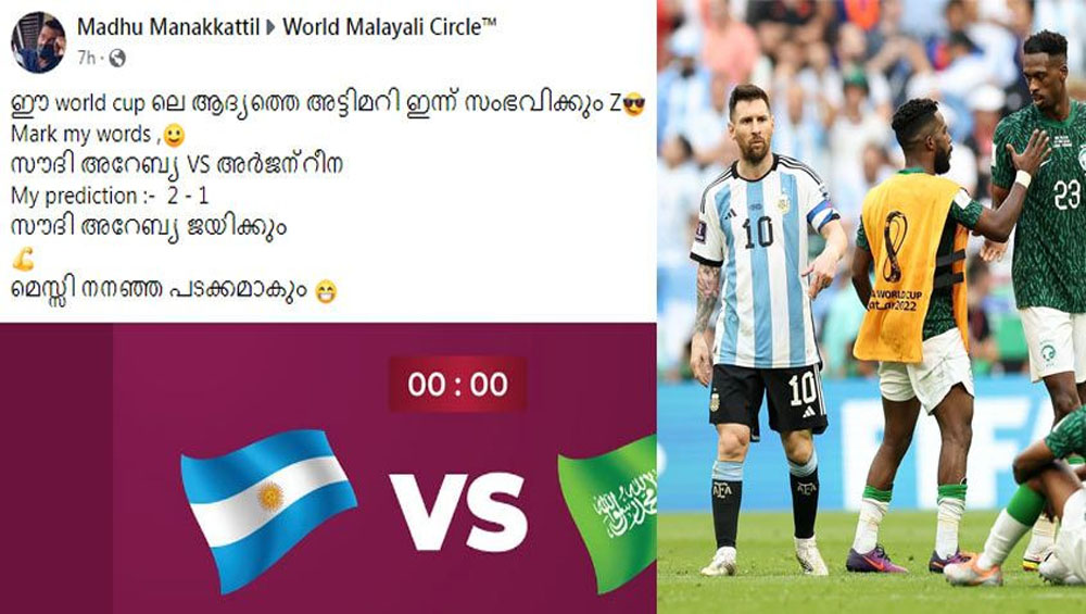 ‘ ഈ വേൾഡ് കപ്പിലെ ആദ്യത്തെ അട്ടിമറി ഇന്ന് സംഭവിക്കും.. Mark my words… സൗദി അറേബ്യ VS അർജന്റീന, My prediction 2 – 1.. സൗദി അറേബ്യ ജയിക്കും മെസ്സി നനഞ്ഞ പടക്കമാകും..‘ ആരും ജയിക്കുമെന്നും, സ്കോര് ലൈന് എന്തായിരിക്കുമെന്നും പോലും ഇയാളുടെ പോസ്റ്റിലുണ്ട്. സോഷ്യല് മീഡിയയില് ഇയാള് താരമായി മാറിയിരിക്കുകയാണ്.