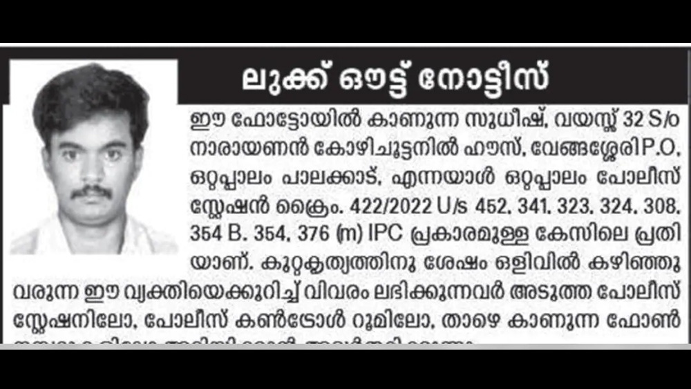 പാലക്കാട്: കഴുത്തിൽ ആയുധം വെച്ച് ഭീഷണിപ്പെടുത്തി യുവതിയെ പീഡിപ്പിച്ച സംഭവത്തിൽ പ്രതിയെ കണ്ടെത്താൻ ലുക്കൗട്ട് നോട്ടീസ് പുറത്തിറക്കി പോലീസ്. ഒളിവിൽപ്പോയ അമ്പലപ്പാറ സ്വദേശി സുധീഷിനെ കണ്ടെത്തുന്നതിനായാണ് ഒറ്റപ്പാലം പോലീസ് ലുക്കൗട്ട് നോട്ടീസ് പുറത്തിറക്കിയത്. 31-കാരിയെ പീഡനത്തിനിരയാക്കിയ കേസിലാണ് നടപടി.