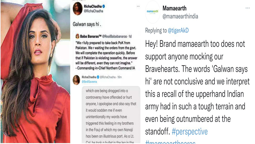 സൈന്യത്തെ അപമാനിച്ച റിച്ച ഛദ്ദയെ ന്യായീകരിച്ച് ട്വീറ്റ്; മാമ എർത്തിന്റെ ഉൽപ്പന്നങ്ങൾ ബഹിഷ്കരിക്കാൻ ആഹ്വാനം- Boycott Campaign against Mama Earth Products