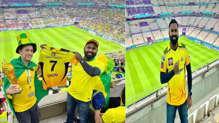 ദോഹ: ഖത്തറിൽ കഴിഞ്ഞ ദിവസം നടന്ന ബ്രസീൽ- സെർബിയ മത്സരത്തിനിടെ ഗാലറിയിൽ എം എസ് ധോണിയുടെ ജേഴ്സിയുമായി ചെന്നൈ ആരാധകൻ. ധോണിയുടെ ജേഴ്സിയുമായി ബ്രസീൽ ആരാധകനോടൊപ്പം നിൽക്കുന്ന ചെന്നൈ സൂപ്പർ കിംഗ്സ് ആരാധകന്റെ ചിത്രമാണ് സാമൂഹിക മാദ്ധ്യമങ്ങളിൽ വൈറലാകുന്നത്. ജേഴ്സി ധരിച്ച് സ്റ്റേഡിയത്തിൽ നിൽക്കുന്ന ആരാധകന്റെ ചിത്രവും പ്രചരിക്കുന്നുണ്ട്.
