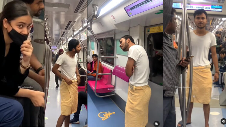 മാനം പോയാലും വേണ്ടില്ല, വൈറൽ ആയാൽ മതി; ഇൻസ്റ്റഗ്രാം റീൽസ് ഇടാൻ ബാത്ടവൽ ഉടുത്ത് ഡൽഹി മെട്രോ ട്രെയിനിൽ യാത്ര ചെയ്ത് യുവാവ് – വീഡിയോ