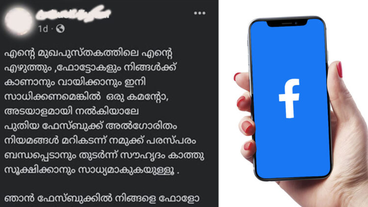 കഴിഞ്ഞ രണ്ട് ദിവസമായി നിരവധി പേരുടെ ഫേസ്ബുക്ക് പ്രൊഫൈലിൽ നിന്ന് പോസ്റ്റ് ചെയ്യപ്പെടുന്നത് ഒരേ കുറിപ്പാണ്. പോസ്റ്റിന് കീഴിൽ ലൈക്കും കമന്റും തരൂ, ഇല്ലെങ്കിൽ ഫേസ്ബുക്ക് അൽഗോരിതം പണി തരുമെന്ന് പറയുന്നതാണ് മിക്കവരുടെയും പോസ്റ്റ്. വൈറലായിക്കൊണ്ടിരിക്കുന്ന ഈ പോസ്റ്റ് പലർക്കുമിടയിൽ ആശങ്ക പടർത്തിയെന്നതാണ് വാസ്തവം. സാങ്കേതിക കാര്യങ്ങളെക്കുറിച്ച് വശമില്ലാത്ത പലരും ഇത്തരം പോസ്റ്റുകൾ കണ്ട് അതേപടി കോപ്പി ചെയ്ത് സ്വന്തം വാളിൽ പോസ്റ്റ് ചെയ്യുകയാണ്. എന്നാൽ ഇത്തരം കുത്ത്, കോമ, ഫേസ്ബുക്ക് അൽഗോരിതം പോസ്റ്റുകൾ അടിസ്ഥാനരഹിതമാണെന്നാണ് കേരളാ പോലീസ് പറയുന്നത്.