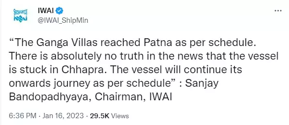 വിനോദസഞ്ചാരികളുമായി ചപ്രയ്‌ക്ക് സമീപമുള്ള ചിരാന്ത് സാരനിലേക്ക് പോകുംവഴി നൗക കുടുങ്ങിയെന്നായിരുന്നു വാർത്ത. എന്നാൽ ഷെഡ്യൂൾ ചെയ്ത പ്രകാരം പട്‌നയിൽ കപ്പലെത്തിയിരുന്നതായി എക്‌സോട്ടിക്ക് ഹെറിറ്റേജ് ഗ്രൂപ്പ് ചെയർമാർ രാജ് സിംഗ് പ്രതികരിച്ചു. കൂടാതെ യാത്രക്കിടെ കപ്പൽ കുടുങ്ങി പോയെന്ന വാർത്ത തികച്ചും വാസ്തവ വിരുദ്ധമാണെന്നും അദ്ദേഹം കൂട്ടിച്ചേർത്തു.