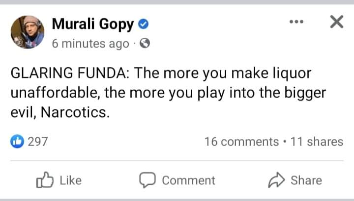 ”GLARING FUNDA: The more you make liquor unaffordable, the more you play into the bigger evil, Narcotics. ” ഇതായിരുന്നു മുരളിയുടെ വാക്കുകൾ.