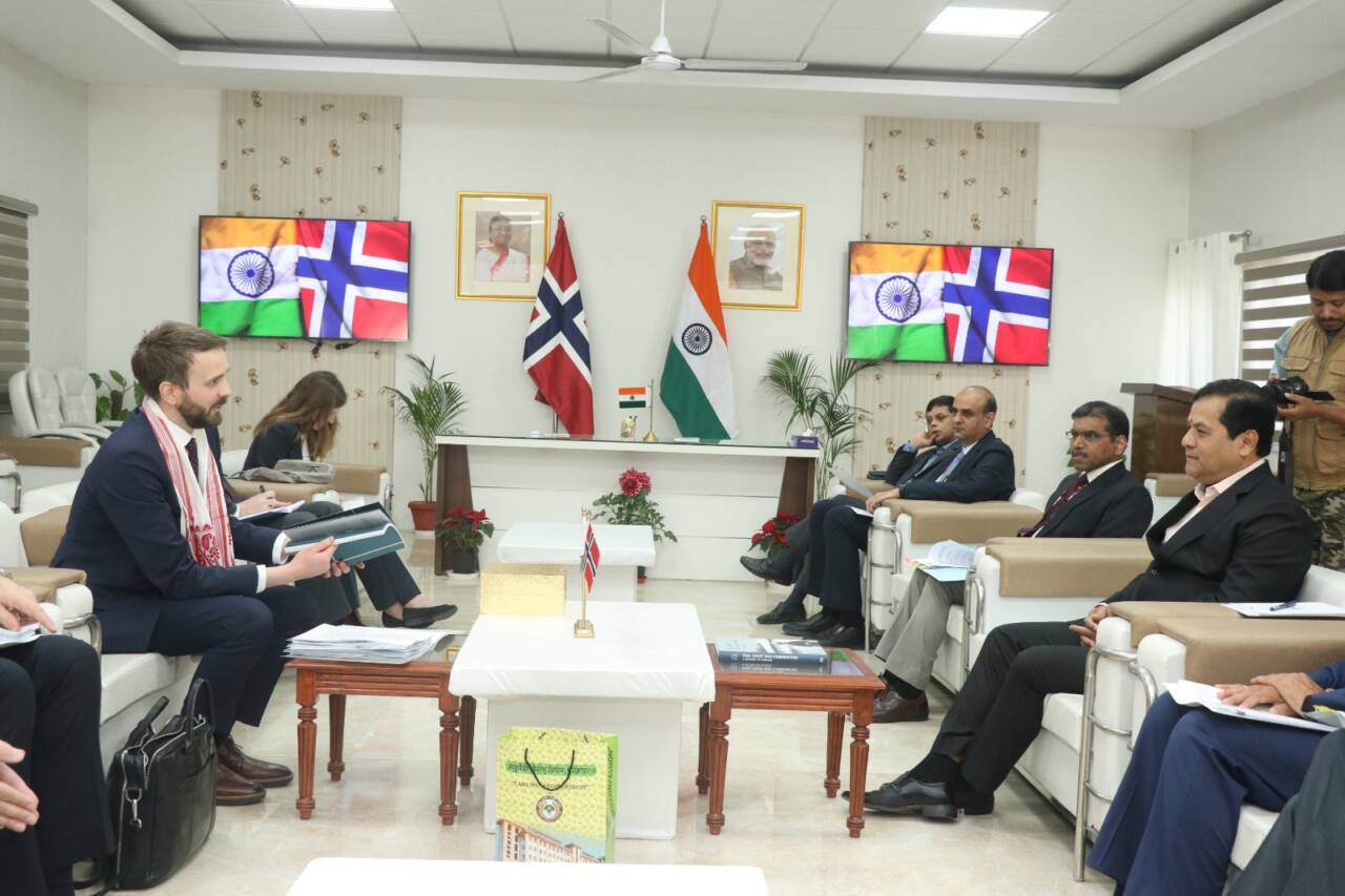 Pleased to meet a delegation led by Norway Trade & Industry Minister HE @jcvestre in New Delhi. 🇮🇳-🇳🇴 has wonderful bilateral ties and we carried forward fruitful discussions on cooperation in the maritime sector, with focus on #GreenShipping & Blue Economy. pic.twitter.com/3fq8wmQhqf