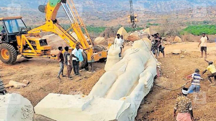 നാല് മാസം മുൻപാണ് നിർമ്മാണം ആരംഭിച്ചത്. ആന്ധ്രപ്രദേശിലെ നന്ദ്യാൽ അല്ലഗഡയിൽ നടന്ന ചടങ്ങിലാണ് കല്ലിൽ കൊത്തിയ പ്രതിമ വേർപ്പെടുത്തിയെടുത്തത്. ഏപ്രിൽ ആദ്യവാരമാകും ഇത് പൂങ്കുന്നത്ത് എത്തിക്കുക. പ്രശസ്ത ശിൽപി വി. സുബ്രഹ്മണ്യം ആചാര്യലുവിന്റെ ശ്രീഭാരതി ശിൽപകലാമന്ദിരമാണ് പ്രതിമ കൊത്തിയെടുത്തത്. 40-ലധികം ശിൽപികളുടെ നാല് മാസത്തെ അദ്ധ്വാനമാണ് ശിൽപം.