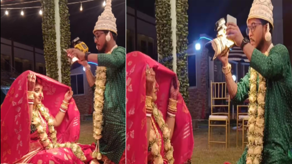 സ്വന്തം വിവാഹ ചിത്രങ്ങൾ വരൻ തന്നെ പകർത്തി. വരണമാല്യം അണിഞ്ഞിരിക്കുന്ന വധുവിന്റെ ഫോട്ടോയാണ് വരൻ പകർത്തിയത്. ഇതിന്റെ വീഡിയോയും സമൂഹ മാദ്ധ്യമങ്ങളിലൂടെ പുറത്തുവന്നിട്ടുണ്ട്. വധുവിന്റെ ചിത്രം വിവിധ ആംഗിളുകളിൽ എടുക്കാൻ ശ്രമിക്കുന്ന വരനാണ് ദൃശ്യങ്ങളിലുള്ളത്. ഇതിനനുസരിച്ച് പല പോസുകളിൽ ഇരിക്കുന്ന വധുവിനെയും വീഡിയോയിൽ കാണാം.