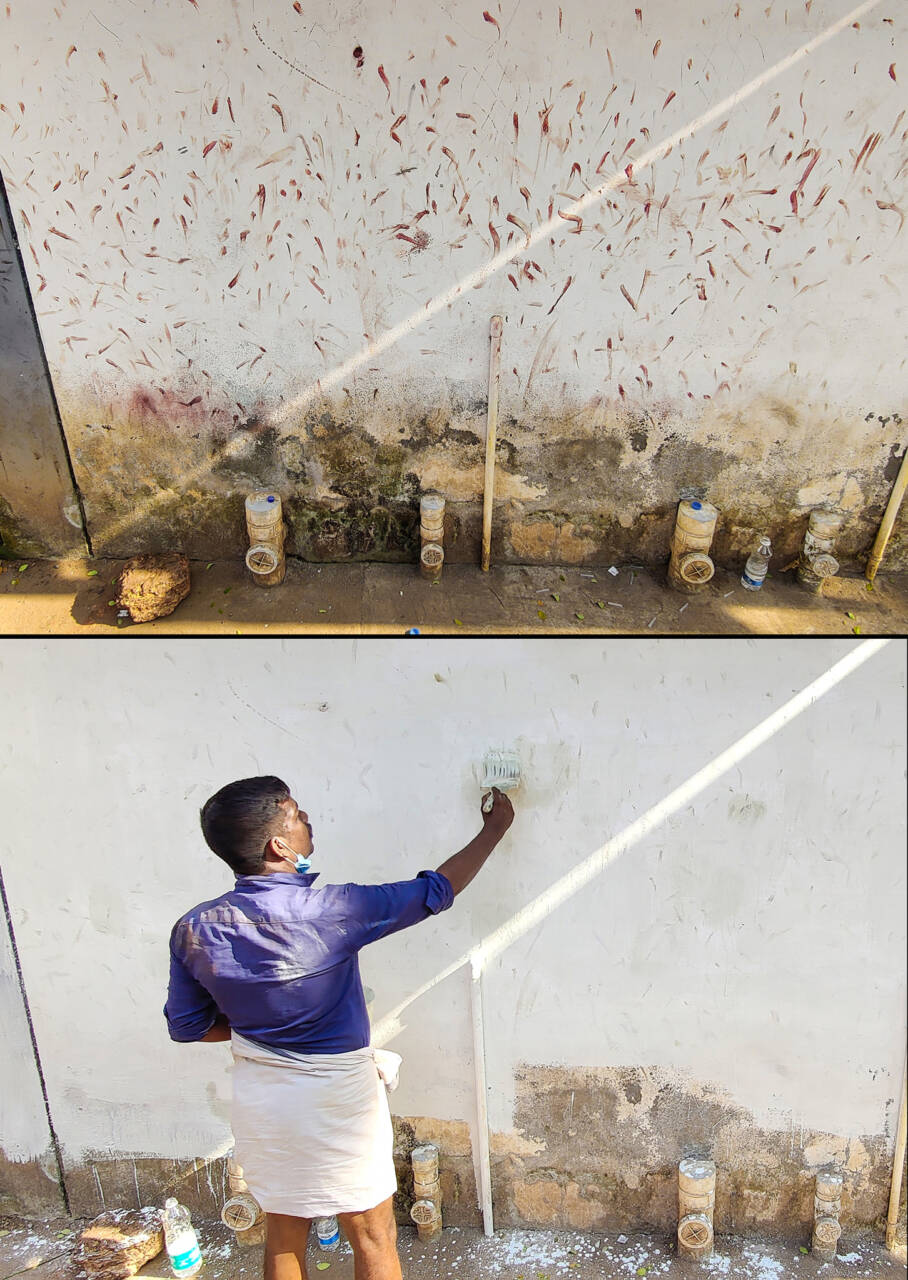 ‘ചോര’ മായുന്ന ചുമർ…ലഹരിയുടെ ചോരപ്പാടുകൾ എന്ന തലക്കെട്ടിൽ മാതൃഭൂമി വെള്ളിയാഴ്ച പ്രസിദ്ധീകരിച്ച ചിത്രമാണ് ആദ്യത്തേത്. ലഹരിക്ക് അടിപ്പെട്ട ഒരു കൂട്ടം പേരുടെ ചോരപ്പാടുകളാണിവയെന്ന വാസ്തവം ആളുകളെ ഞെട്ടിച്ചു. കോഴിക്കോട് ബീച്ച് ആശുപത്രിയിലെ ഇ.എൻ.ടി. പുതിയ ബ്ലോക്കിന്റെ പിൻവശത്തെ മതിലാണ് ഇത്. ഇതിന് പിറകിൽ വന്നിരുന്ന് സിറിഞ്ചുപയോഗിച്ച് ലഹരി കുത്തിവെച്ച ശേഷം വരുന്ന ചോര തുടയ്ക്കാൻ പഞ്ഞിയില്ലാത്തതിനാൽ വിരലുകൊണ്ട് തുടച്ചു ചുമരിൽ തേച്ച പാടുകളാണിവ. സി.സി.ടി.വി. ക്യാമറകളില്ലാത്ത, അധികമാരും എത്താത്ത ഇടമെന്ന സൗകര്യം ഉപയോഗപ്പെടുത്തിയായിരുന്നു ലഹരിക്കാർ ഇവിടം താവളമാക്കിയിരുന്നത്. ഈ ചിത്രം വ്യാപകമായി ചർച്ചചെയ്യപ്പെട്ടതോടെ അധികാരികൾ കണ്ണുതുറന്നു. ചോരപ്പാടുകളുള്ള ചുമർ പെയിന്റ് അടിച്ചു വൃത്തിയാക്കുന്ന ശനിയാഴ്ചത്തെ ദൃശ്യമാണ് വലത്ത്. ഈ ഭാഗത്തേക്ക് ആളുടെ പ്രവേശനം പൂർണമായും തടഞ്ഞുകൊണ്ട്, എല്ലാ വഴികളും കെട്ടിയടക്കുന്നുമുണ്ട്.
