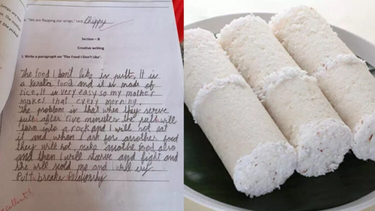 ഈ സ്വാദൂറും പുട്ട് കുടുംബബന്ധങ്ങളെ തകർക്കുമെന്ന് പറഞ്ഞാലോ?! പരീക്ഷയ്ക്ക് ഇഷ്ടമില്ലാത്ത ഭക്ഷണത്തെക്കുറിച്ച് കുറിപ്പ് തയ്യാറാക്കാൻ പറഞ്ഞപ്പോൾ മൂന്നാം ക്ലസുകാരന് എഴുതിയ കുറിപ്പാണ് ഇന്റർനെറ്റ് ലോകത്ത് പരക്കുന്നത്. പുട്ട് തനിക്ക് ഇഷ്ടമില്ലെന്നും അത് ബന്ധങ്ങൾ തകർക്കുമെന്നുമാണ് മൂന്നാം ക്ലാസുകാരൻ എഴുതിയത്.