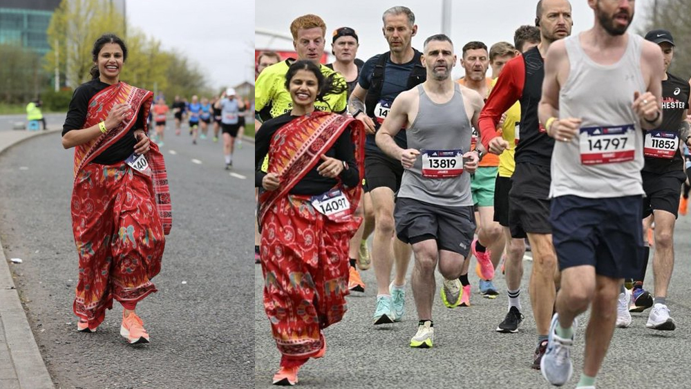സാരിയിൽ അനായാസമായാണ് യുവതി മാരത്തണിൽ പങ്കെടുത്തത്. മാഞ്ചസ്റ്ററിലെ ഹൈസ്കൂൾ അദ്ധ്യാപകയും നോർത്ത് വെസ്റ്റ് ഇംഗ്ലണ്ട് കമ്മ്യൂണിറ്റിയിലെ അംഗവുമാണ് മധുസ്മിത ജീന ദാസ്. മാരത്തണിൽ ഓടുന്ന മധുസ്മിതയ്ക്ക് പ്രോത്സാഹനം നൽകുന്ന ബന്ധുക്കളെയും സുഹൃത്തുക്കളെയും വീഡിയോയിൽ ദൃശ്യമാണ്.