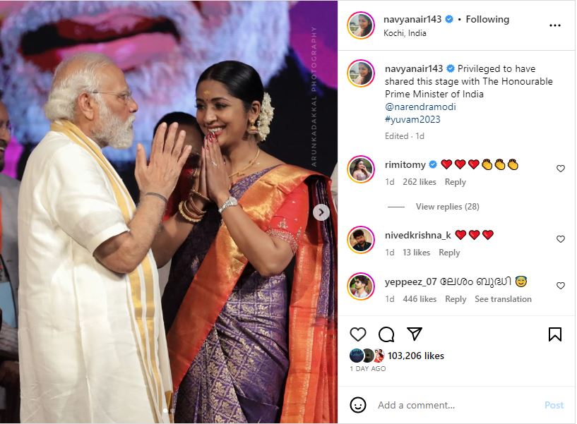 എന്നാൽ ഇത്തരം വ്യാജവാർത്തകൾക്കും ട്രോളുകൾക്കും വിമർശനത്തിനുമുള്ള മറുപടിയായി പ്രധാനമന്ത്രിക്കൊപ്പമുള്ള ചിത്രം ഇൻസ്റ്റഗ്രാമിൽ പങ്കുവച്ചിരിക്കുകയാണ് താരമിപ്പോൾ. ‘ ബഹുമാനപ്പെട്ട ഇന്ത്യൻ പ്രധാനമന്ത്രിക്കൊപ്പം വേദി പങ്കിടാൻ സാധിച്ചതിൽ അഭിമാനമുണ്ട്’ എന്ന അടിക്കുറിപ്പോടെയാണ് നടി ചിത്രങ്ങൾ ഇൻസ്റ്റഗ്രാമിൽ പങ്കുവച്ചിരിക്കുന്നത്. ഇതോടെ വിമർശകരുടെ വായടപ്പിച്ചിരിക്കുകയാണ് നടി.