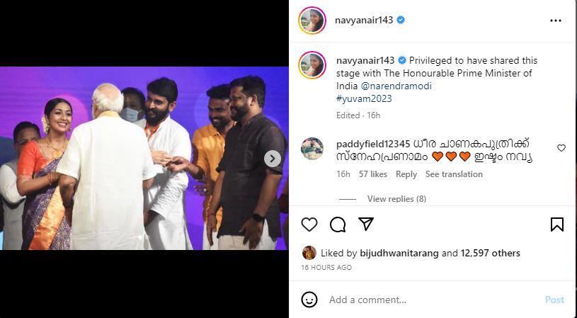 കേരളാ സന്ദർശനത്തിനിടെ പ്രധാനമന്ത്രി നരേന്ദ്രമോദിയോടൊപ്പം വേദിപങ്കിട്ടതിനെ തുടർന്നുണ്ടായ സെെബർ അക്രമണങ്ങൾക്ക് മൂക്ക് കയറിട്ട് നടി നവ്യ നായർ. രണ്ട് ദിവസത്തെ സന്ദർശനത്തിനായി തിങ്കളാഴ്ച വൈകിട്ടാണ് പ്രധാനമന്ത്രി നരേന്ദ്രമോദി കൊച്ചിയിലെത്തിയത്. തുടർന്ന് മോദിയുടെ ‘യുവം 2023’ ൽ ഉണ്ണിമുകുന്ദനും നവ്യ നായരും അപർണ ബാലമുരളിയുമടക്കമുള്ള താരങ്ങൾ പങ്കെടുത്തത് ഏറെ ശ്രദ്ധ നേടിയിരുന്നു. ഇതിന്റെ ചിത്രങ്ങൾ സമൂഹ മാദ്ധ്യമങ്ങളിൽ പ്രചരിക്കുകയും ഇവർക്കെതിരെ വലിയരീതിയിൽ സെെബർ ആക്രമണമാണ് നടന്നത്.
