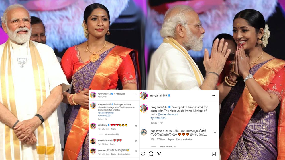 കേരളാ സന്ദർശനത്തിനിടെ പ്രധാനമന്ത്രി നരേന്ദ്രമോദിയോടൊപ്പം വേദിപങ്കിട്ടതിനെ തുടർന്നുണ്ടായ സെെബർ അക്രമണങ്ങൾക്ക് മൂക്ക് കയറിട്ട് നടി നവ്യ നായർ. രണ്ട് ദിവസത്തെ സന്ദർശനത്തിനായി തിങ്കളാഴ്ച വൈകിട്ടാണ് പ്രധാനമന്ത്രി നരേന്ദ്രമോദി കൊച്ചിയിലെത്തിയത്. തുടർന്ന് മോദിയുടെ ‘യുവം 2023’ ൽ ഉണ്ണിമുകുന്ദനും നവ്യ നായരും അപർണ ബാലമുരളിയുമടക്കമുള്ള താരങ്ങൾ പങ്കെടുത്തത് ഏറെ ശ്രദ്ധ നേടിയിരുന്നു. ഇതിന്റെ ചിത്രങ്ങൾ സമൂഹ മാദ്ധ്യമങ്ങളിൽ പ്രചരിക്കുകയും ഇവർക്കെതിരെ വലിയരീതിയിൽ സെെബർ ആക്രമണമാണ് നടന്നത്.