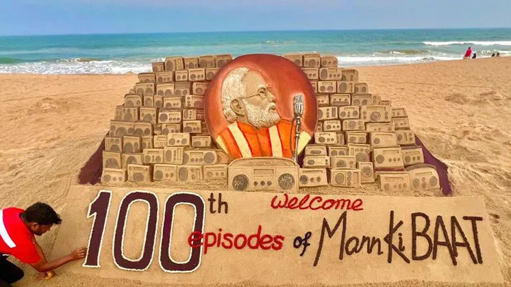 ഭുവനേശ്വർ: പ്രധാനമന്ത്രിയുടെ പ്രതിമാസ റേഡിയോ പരിപാടിയായ മൻ കി ബാത്തിന്റെ നൂറാം എപ്പിസോഡിന് ഭാഗമായി മണൽ ശിൽപം സൃഷ്ടിച്ച് കലാകാരൻ. ഒഡീഷയിലെ പുരി ബീച്ചിലിലാണ് പ്രശസ്ത മണൽ കലാകാരനായ സുദർശൻ പട്നായിക് മണൽ ശിൽപം സൃഷ്ടിച്ചത്. മൻ കി ബാത്തിന്റെ 100-ാം എപ്പിസോഡ് എന്ന അടിക്കുറിപ്പോടെയാണ് റേഡിയോ മൈക്ക് പിടിച്ച് നിൽക്കുന്ന പ്രധാനമന്ത്രി നരേന്ദ്രമോദിയുടെ ശിൽപം രൂപീകരിച്ചിരിക്കുന്നത്.