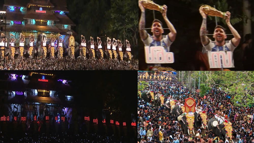 തൃശൂർ: വിസ്മയം ഒളിപ്പിച്ച നിലയിലാണ് തൃശൂർ പൂരത്തിൽ ഇത്തവണ കുടകളിറക്കിയത്. പ്രത്യേക കുടകളിൽ എല്ലാം ഒന്നിനൊന്നിന് മികച്ചതായിരുന്നെങ്കിലും കാണികളെ ആവേശത്തിലാക്കിയത് തിരുവമ്പാടി ഇറക്കിയ മെസ്സിയുടെ കുടയാണ്. ലോകകിരീടം നേടിയ മെസിക്ക് ആശംസയുമായി തിരുവമ്പാടിയുടെ വേറിട്ട കുട ആനപ്പുറത്തുയർന്നതോടെ കാണികൾ ആർത്തു വിളിച്ചു. മെസ്സിയുടെ കുടയിൽ ലോകമാകമാനമുള്ള പൂരപ്രേമികൾക്ക് ആശംസയും നേർന്നു.