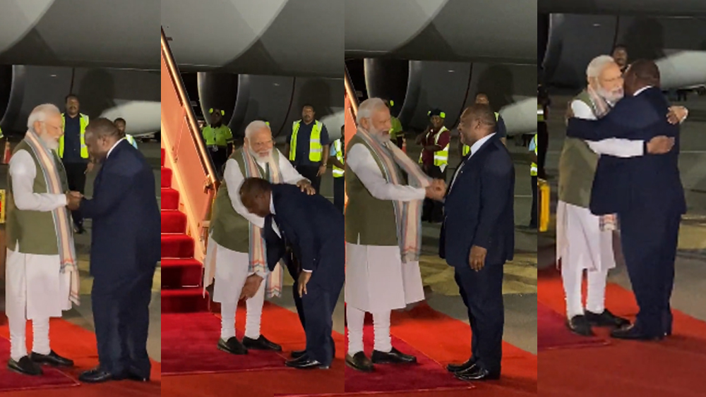 കൈകോർത്ത് സംസാരിക്കുന്നതിനിടെ ജെയിെസ് പ്രധാനമന്ത്രിയുടെ കാൽ തൊട്ട് വന്ദിച്ചു. ഇടൻ നരേന്ദ്രമോദി അദ്ദേഹത്തെ എഴുന്നേൽപ്പിച്ച് വാരിപ്പുണർന്നു. സാധാരണ സൂര്യാസ്തമയത്തിന് ശേഷം രാജ്യം സന്ദർശിക്കുന്ന ഒരു നേതാവിനും ആചാരപരമായ വരവേൽപ്പ് പാപുവ ന്യൂഗിനി നൽകാറില്ല. എന്നാൽ നരേന്ദ്രമോദിയുടെ വരവിൽ എല്ലാ ആചാരങ്ങളും രാജ്യം മാറ്റി വെച്ചു. പ്രാദേശിക സമയം രാത്രി 10-ന് ശേഷമാണ് പ്രധാനമന്ത്രി രാജ്യത്തെത്തിയത്. 19 തോക്കുകളുടെ സല്യൂട്ട്, ഗാർഡ് ഓഫ് ഓണർ, ആചാരപരമായ സ്വീകരണം എന്നിവയും നരേന്ദ്രമോദിയ്ക്ക് നൽകി. ഇന്ത്യൻ സമൂഹവും സ്വീകരിക്കാനെത്തിയിരുന്നു. ഫോറം ഫോർ ഇന്ത്യ-പസഫിക് ഐലൻഡ്സ് കോർപറേഷൻ (എഫ്ഐപിഐസി) ഉച്ചകോടിയിൽ പങ്കെടുക്കാനാണ് നരേന്ദ്രമോദിയെത്തിയത്.