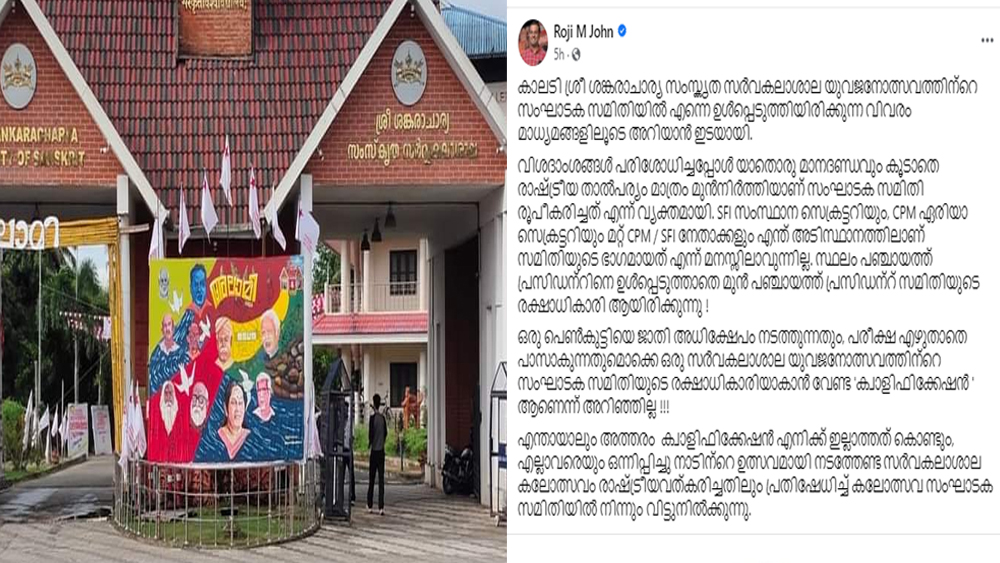 ‘ഒരു പെൺകുട്ടിയെ ജാതി അധിക്ഷേപം നടത്തുന്നതും, പരീക്ഷ എഴുതാതെ പാസാകുന്നതുമൊക്കെ ഒരു സർവകലാശാല യുവജനോത്സവത്തിന്റെ സംഘാടക സമിതിയുടെ രക്ഷാധികാരിയാകാൻ വേണ്ട ‘ക്വാളിഫിക്കേഷൻ’ ആണെന്ന് അറിഞ്ഞില്ല. എന്തായാലും അത്തരം ക്വാളിഫിക്കേഷൻ തനിക്ക് ഇല്ലാത്തത് കൊണ്ടും നാടിന്റെ ഉത്സവമായി നടത്തേണ്ട കലോത്സവം രാഷ്‌ട്രീയവത്കരിച്ചതിലും പ്രതിഷേധിച്ച് കലോത്സവ സംഘാടക സമിതിയിൽ നിന്നും വിട്ടുനിൽക്കുന്നു എന്നും റോജി എം ജോൺ പറഞ്ഞു.